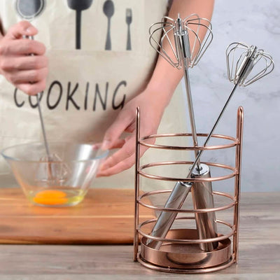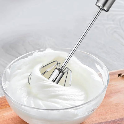 Nosso Batedor Automático giratório simplifica o processo. Sem eletricidade ou bateria necessária - basta pressionar a alça e as lâminas de aço inoxidável giram, acelerando o processo sem esforço.